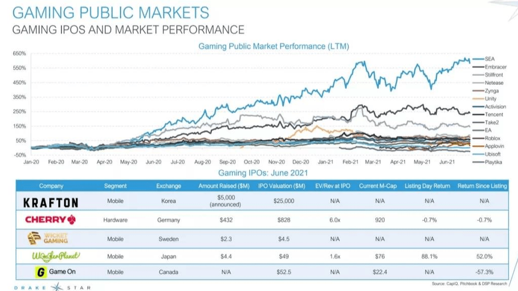 据投行Drake Star Partners的数据显示,今年上半年,游戏行业的投融资宣布和完成的交易超过635笔,交易额飙升至创纪录的600亿美元。仅半年,用于游戏收购、投资和公开发行的资金几乎是2020全年的两倍。