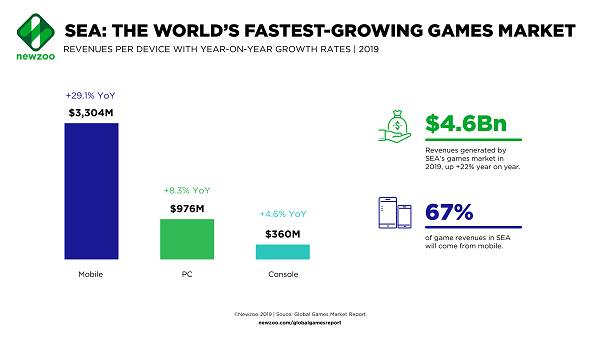由于移动设备使用量的不断增加,东南亚上网人数持续增加。Newzoo 的数据显示,东南亚地区已成为了全球发展最快的游戏市场。2019 年,东南亚游戏市场估值为46亿美元,同比增长22.0%,潜力巨大。那么,游戏发行商想在东南亚拓展游戏市场有什么需要特别注意的呢?