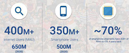 伴随着印度国力的增长,印度移动互联网市场近些年增长也非常迅猛。印度拥有13亿人口,其中中产阶级有2.67亿,25岁以下年轻人有6亿之多。在印度,使用智能手机的用户已经突破3.5亿,其中70%的智能手机内存大于2G。据IMRB预测,到2020年智能手机将覆盖印度5亿人口。