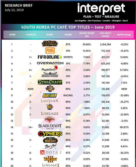 近日,市场研究公司Interpret发布了《韩国网吧研究报告》。数据显示,仅有两款游戏的游戏时间占比超过了两位数。其中,《英雄联盟》排名第一,6月占韩国网吧游戏时间的近40%。平均每天,《英雄联盟》的游戏时间超过216万小时,不过与5月相比下降0.25%。