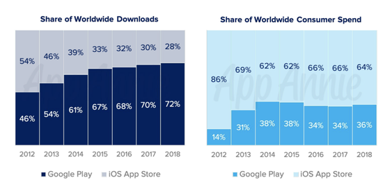 移动应用市场研究机构App Annie发现,智能手机已经成为了人们手中主要的便携游戏机,在该机构发布的最新报告中,他们对2018年度全世界移动应用市场进行了分析。数据显示,在2018年中,游戏下载量在应用总下载量中占比33%,人们在游戏中花费占应用总消费量的74%。