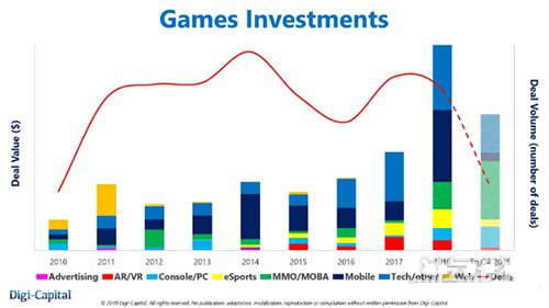 报告显示,过去18个月里,游戏行业投资金额达到96亿美元(约合人民币659亿),但并购和首次公开募股(IPO)却降至2010年以来的最低水平。其中,2018年游戏业投资金额达到创记录的58亿美元,而在2019年上半年投资金额达到38亿美元。