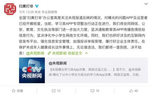1月18日消息,据全国“扫黄打非”办公室官方微博消息,全国“扫黄打非”办公室高度关注央视报道反映的情况,对曝光的问题APP及运营者已经开展核查。扫黄打非办称,当前,学习类App专项整治行动正在进行,将会同网信、公安、教育、文化执法等部门进一步加大力度,坚决遏制教育类App传播色情低俗信息行为,坚决净化中小学生网络文化环境。