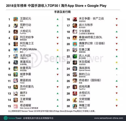 1月17日,移动应用分析平台Sensor Tower发布了2018全年中国手游出海收入TOP30。2018年是中国手游出海转折的一年,从之前的局部市场探索,到大举买量配合本地化市场活动,越来越多厂商投身其中。出海厂商显然已经摸索出适合各自目标市场的打法套路,过去一年亦不乏爆款空降Sensor Tower月度出海榜单,随之而来的是TOP30榜首收入,以及准入门槛两大指标的大幅提升。