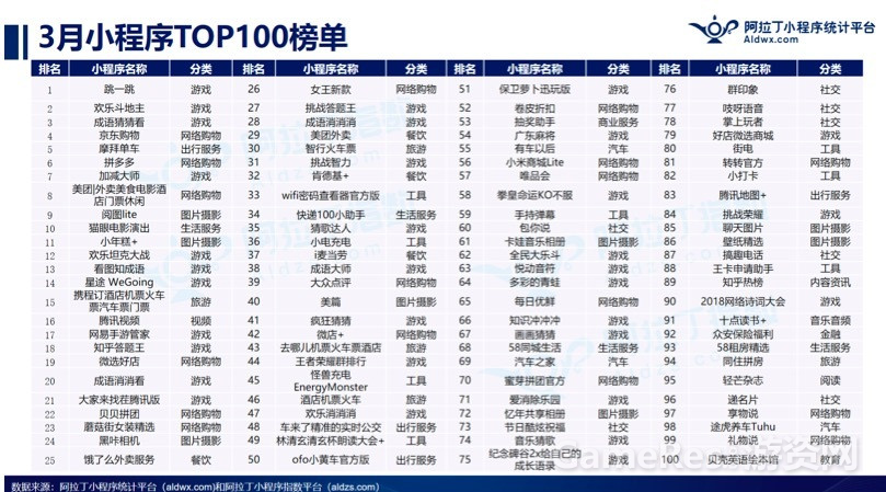 2018年4月18日,阿拉丁小程序统计平台发布3月份Top100榜单,根据报告,在全品类小程序中,最值得关注的依旧是小游戏。2017年9月,游戏类小程序在Top 100产品中占比只有4%,如今,已经飙升至33%。