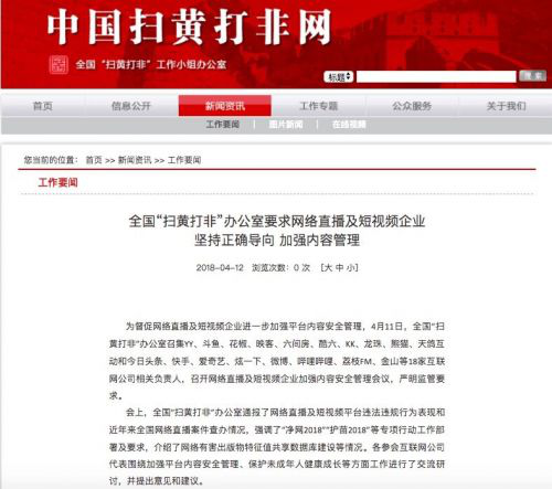 4月13日消息,为督促网络直播及短视频企业进一步加强平台内容安全管理,全国“扫黄打非”办公室日前召集YY、斗鱼、花椒、映客和今日头条、快手等18家互联网公司相关负责人,召开网络直播及短视频企业加强内容安全管理会议,严明监管要求。