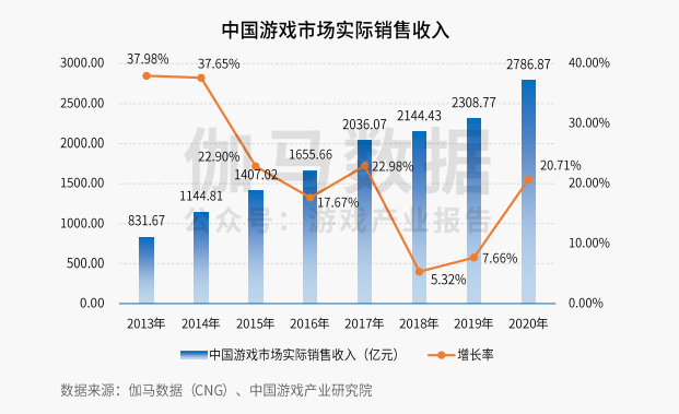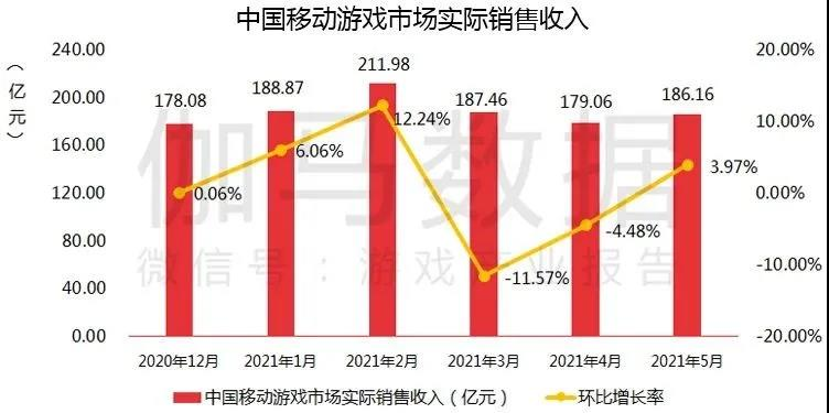 伽马数据《2021年5月移动游戏报告》显示:2021年5月,中国移动游戏市场实际销售收入186.16亿元,相比4月,略升3.97%;与去年5月相比,增长5.28%
