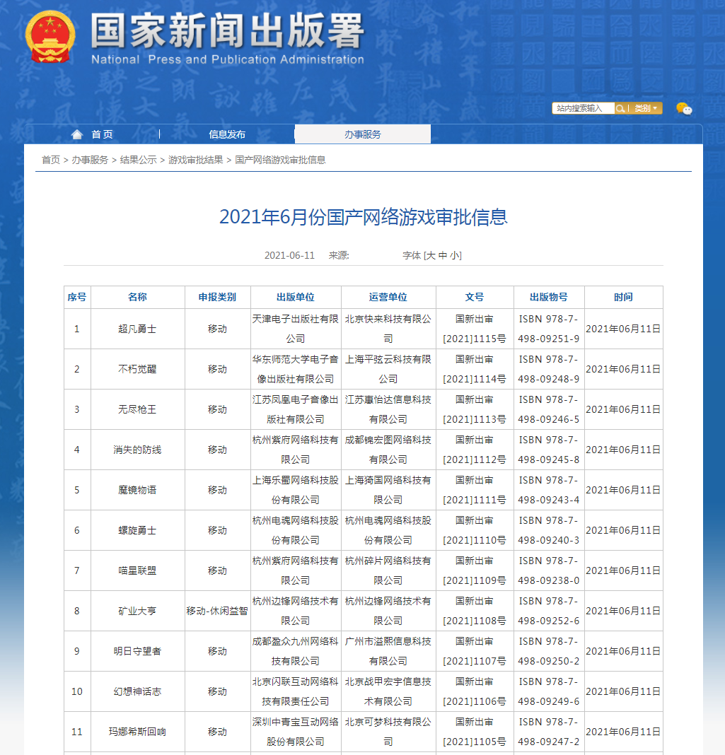 2021年6月11日,国家新闻出版署发布了《2021年6月份国产网络游戏审批信息》。此次版号是2021年第八批,距离上一次公示间隔为18天。